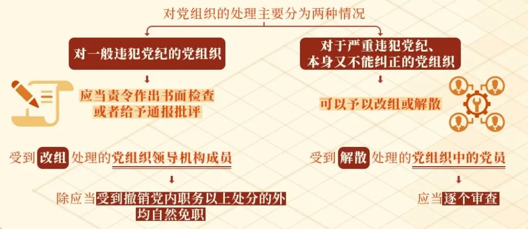 根據(jù)《中國共產(chǎn)黨紀(jì)律處分條例》規(guī)定,對黨組織的處理主要分為兩種情況:對一般違犯黨紀(jì)的黨組織,上級黨組織應(yīng)當(dāng)責(zé)令其作出書面檢查或者給予通報(bào)批評;對于嚴(yán)重違犯黨紀(jì)、本身又不能糾正的黨組織,上一級黨的委員會(huì)在查明核實(shí)后,根據(jù)情節(jié)的嚴(yán)重程度,可以予以改組或解散。