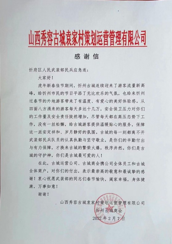 感謝信中,山西秀容古城袁家村策劃運(yùn)營管理有限公司和忻州古城商會(huì)對(duì)物業(yè)公司民兵應(yīng)急連在春節(jié)期間面對(duì)古城客流量增大,隊(duì)員們堅(jiān)守崗位,圓滿完成安保任務(wù)給與了充分肯定和表示了崇高敬意,并致以衷心感謝和衷心祝愿!