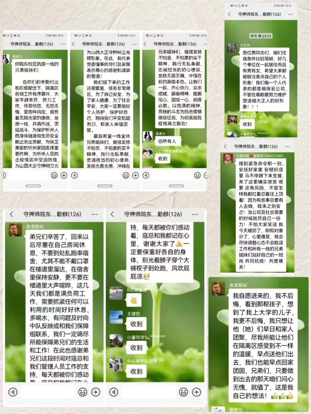 此外,頓村棚戶區(qū)、師院主校區(qū)、民兵應急、醫(yī)療機構、交通樞紐等其它五支突擊分隊全體參戰(zhàn)隊員在做好自身防護的前提下,積極配合相關單位履職盡責。在第二方艙醫(yī)院和龍崗二區(qū)、頓村棚戶區(qū)隔離點執(zhí)行外圍警戒的直屬公司和機關部門人員,不懼危險、堅守崗位,時刻保持高度警惕,輪班值守重要通道,嚴禁無關人員進入隔離地帶、破壞隔離設施,確保隔離點和方艙周邊安全有序;在師院主校區(qū)、頓村棚戶區(qū)隔離點執(zhí)行餐食物資配送的機關部門和物業(yè)公司人員,不辭辛勞、上下奔波,及時把美味、可口、溫熱的飯菜送到隔離人員手中,像一抹抹溫暖的陽光,用溫情守護讓隔離人員安心、舒心;在市醫(yī)院、中醫(yī)院、忻州西站等處在執(zhí)行秩序維護的保安直屬公司人員,認真把關、仔細查驗進出人員的“三碼一溫”,有力地保障了重點部位疫情防控期間的安全穩(wěn)定運行。