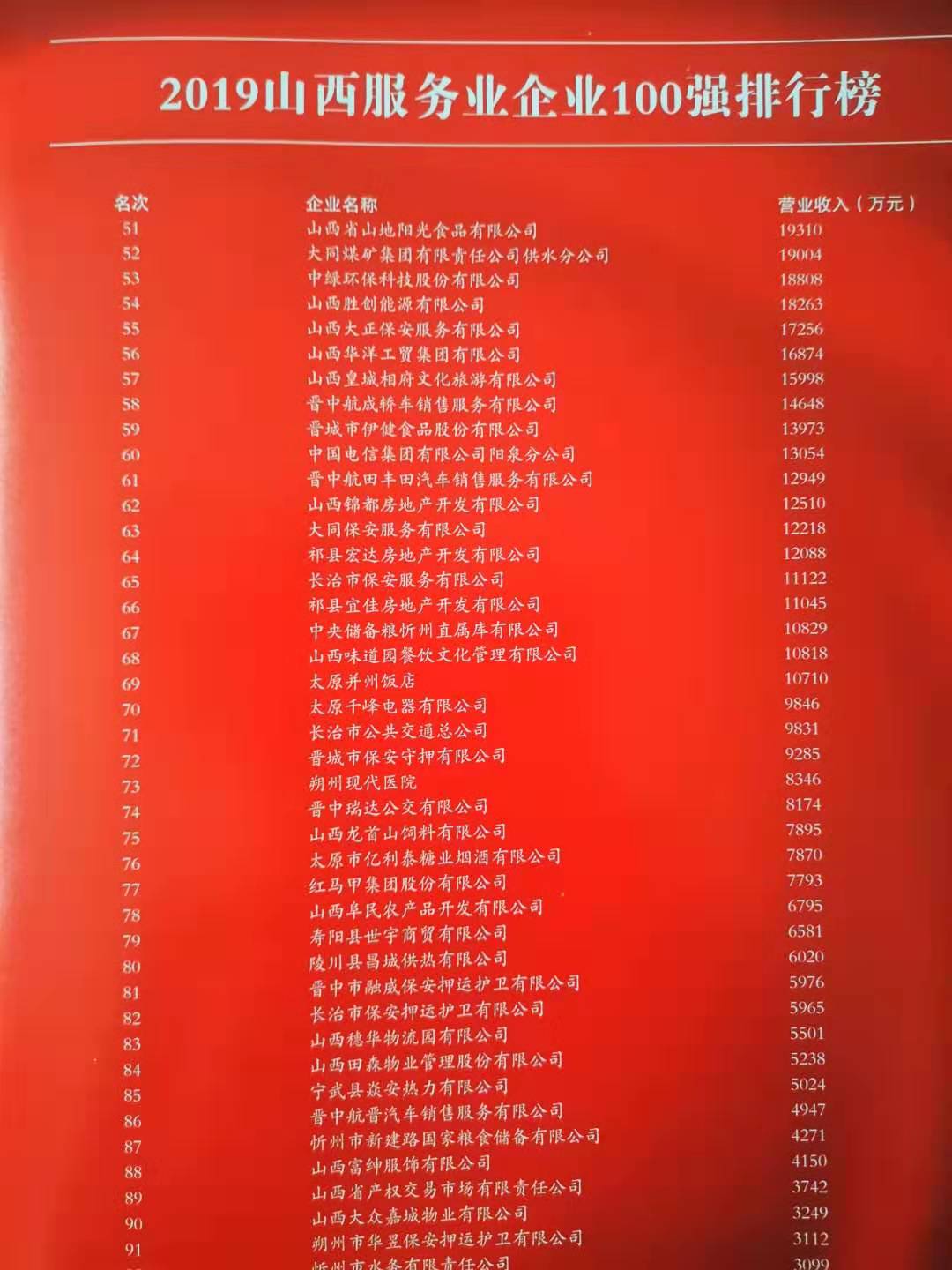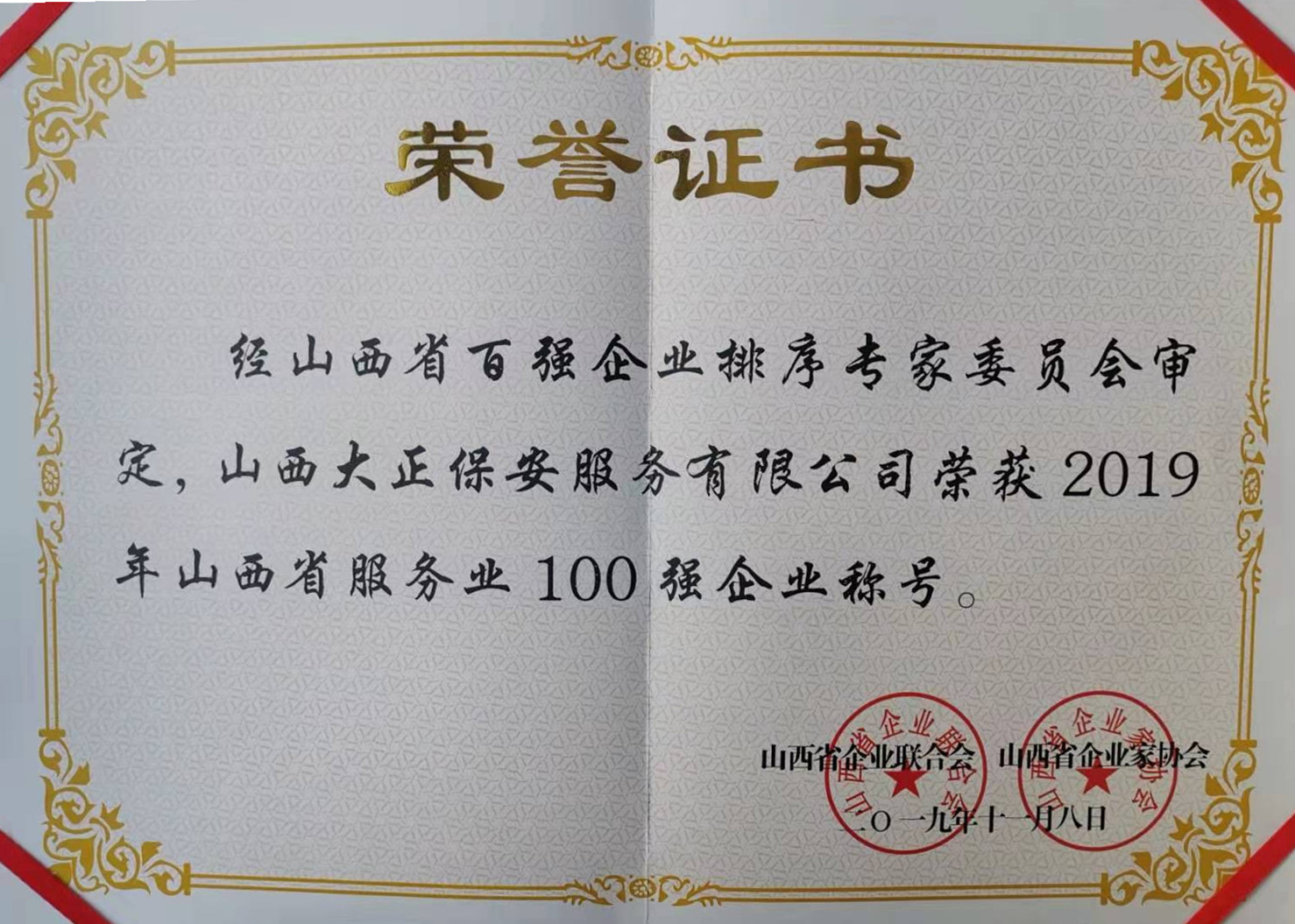 11月8日,2019山西企業(yè)100強(qiáng)在省城太原發(fā)布。經(jīng)山西省百?gòu)?qiáng)企業(yè)排序?qū)<椅瘑T會(huì)審定,山西大正保安服務(wù)有限公司再次榮獲“山西省服務(wù)業(yè)100強(qiáng)企業(yè)”,這是該公司自2014年以來連續(xù)五次榮登該榜。公司黨委副書記、副總經(jīng)理陳志平前往參會(huì)。
