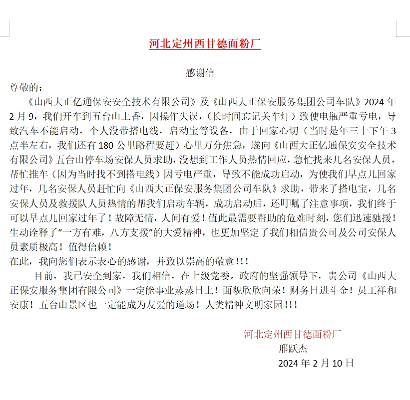 這些看似微不足道的小事,卻讓游客感受到了五臺(tái)山不僅有著豐富的文化底蘊(yùn)和美麗的自然風(fēng)光,更有著溫暖人心的服務(wù)。為了表達(dá)對執(zhí)勤隊(duì)員無私幫助的感激之情,一位游客特意寫了一封感謝信,贊揚(yáng)他們的專業(yè)和熱心,感謝他們?yōu)橛慰蛶淼谋憷桶残摹?/p>