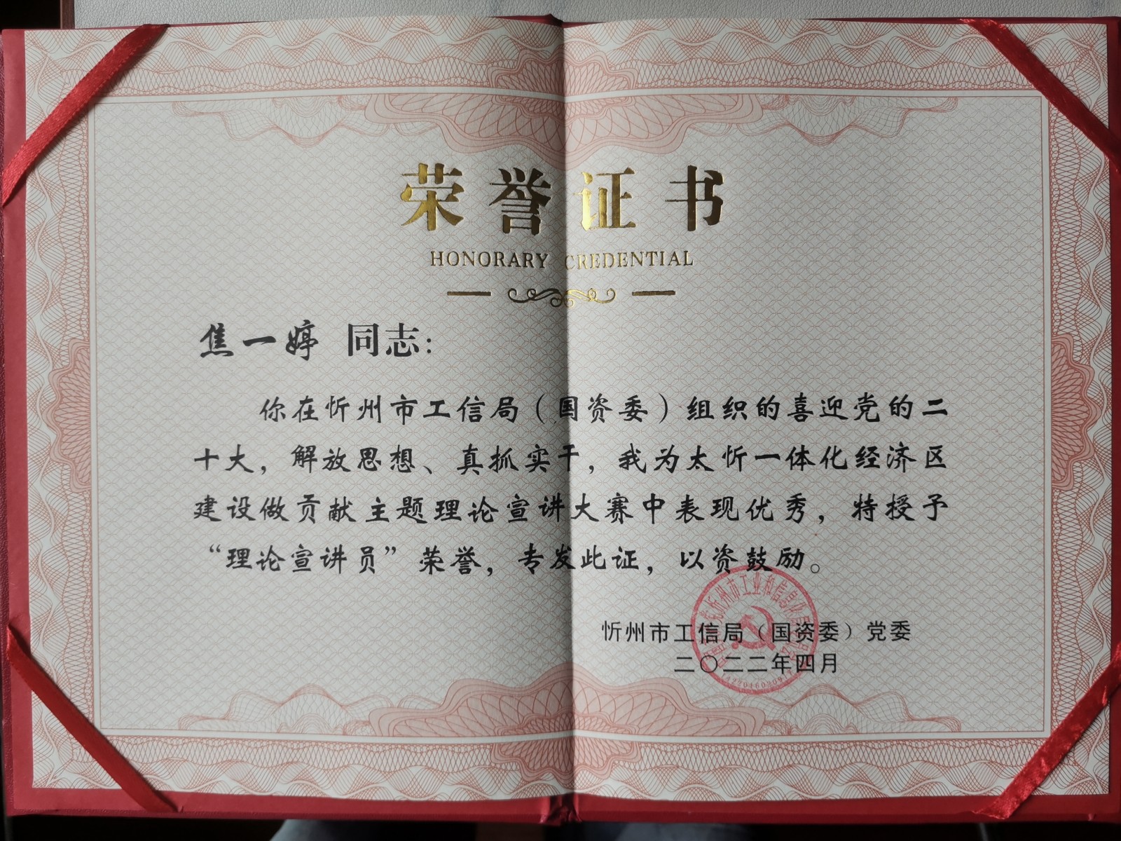 3月21日,以喜迎黨的二十大,解放思想、真抓實(shí)干,我為太忻一體化經(jīng)濟(jì)區(qū)建設(shè)做貢獻(xiàn)為主題的“忻州市第二屆理論宣講大賽”中,我公司參賽人員焦一婷緊扣演講主題,以“忻州市創(chuàng)建文明城市”為抓手,充分結(jié)合自己在創(chuàng)建文明城市中的所做、所見(jiàn)、所聞,就作為一名國(guó)企員工如何在工作中解放思想,真抓實(shí)干展開(kāi)演講,用實(shí)實(shí)在在發(fā)生在身邊的志愿實(shí)例說(shuō)明問(wèn)題,通俗易懂,極富感染力。大賽組委會(huì)結(jié)合當(dāng)前省內(nèi)疫情防控實(shí)際,開(kāi)展線下比賽組織參賽選手以錄制視頻的形式參賽,最終經(jīng)過(guò)忻州市工信局(國(guó)資委)黨委的評(píng)比,參賽人員焦一婷榮獲“理論宣講員”稱(chēng)號(hào),并獲得獎(jiǎng)品《人世間》、《創(chuàng)業(yè)史》書(shū)籍兩套。