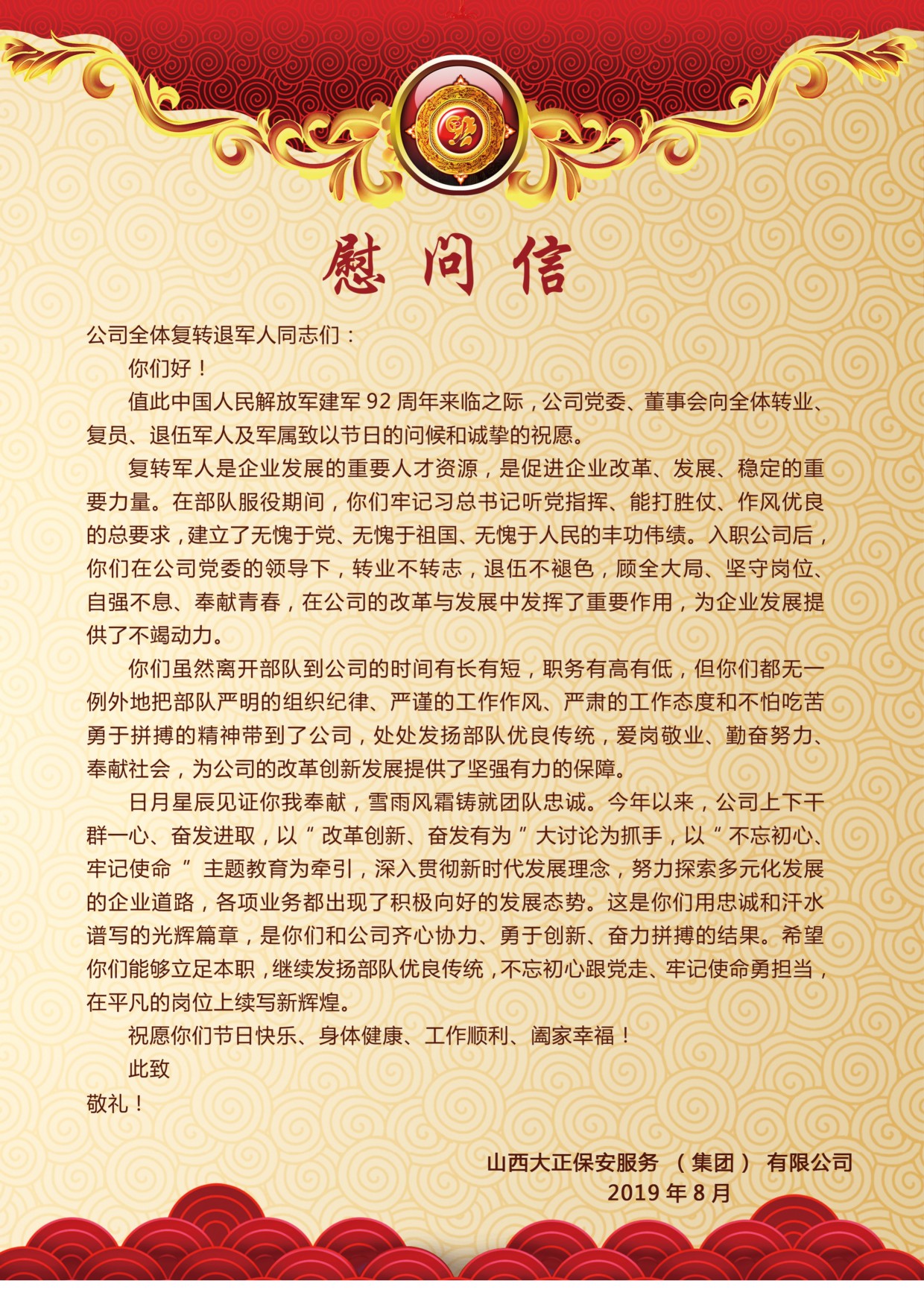 黨委委員、副總經(jīng)理趙培宏宣讀《慰問信》,信中談到:公司的每位復(fù)轉(zhuǎn)軍人都是企業(yè)發(fā)展的重要人才資源,是促進(jìn)企業(yè)改革、發(fā)展、穩(wěn)定的重要力量,處處發(fā)揚(yáng)著部隊(duì)優(yōu)良傳統(tǒng),為公司的改革創(chuàng)新發(fā)展提供了堅(jiān)強(qiáng)有力的保障。希望大家能夠以“改革創(chuàng)新、奮發(fā)有為”大討論為抓手,以“不忘初心、牢記使命”主題教育為牽引,立足本職,發(fā)揚(yáng)部隊(duì)優(yōu)良傳統(tǒng),不忘初心跟黨走、牢記使命勇?lián)?dāng),在平凡的崗位上續(xù)寫新輝煌。