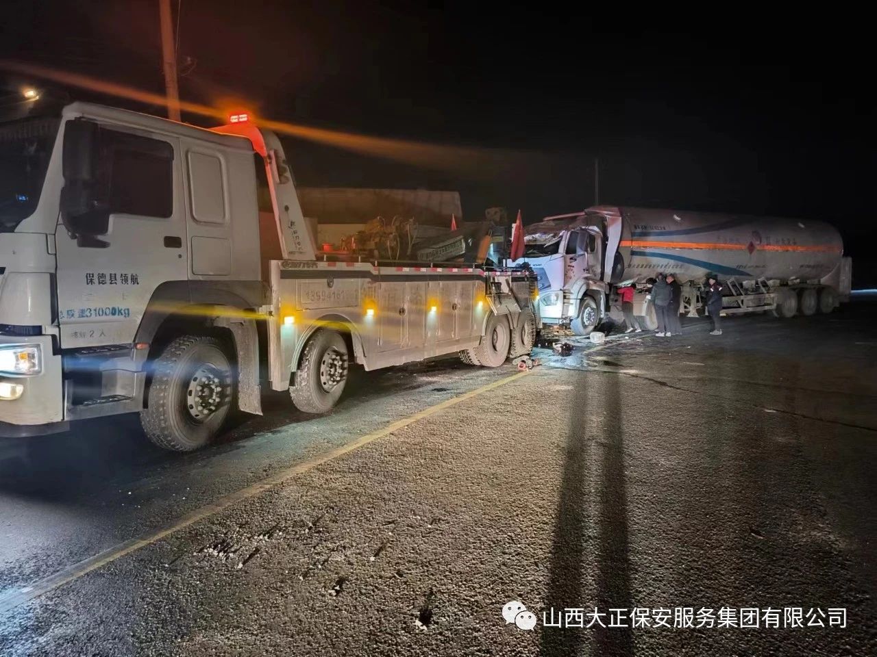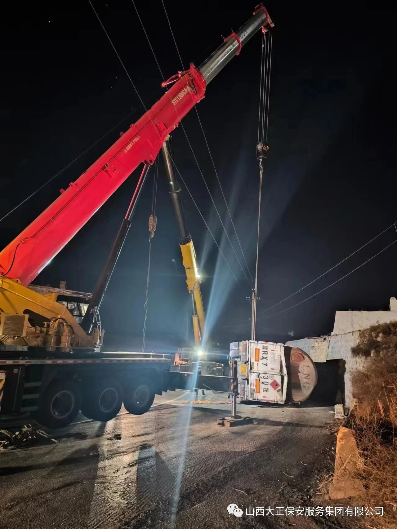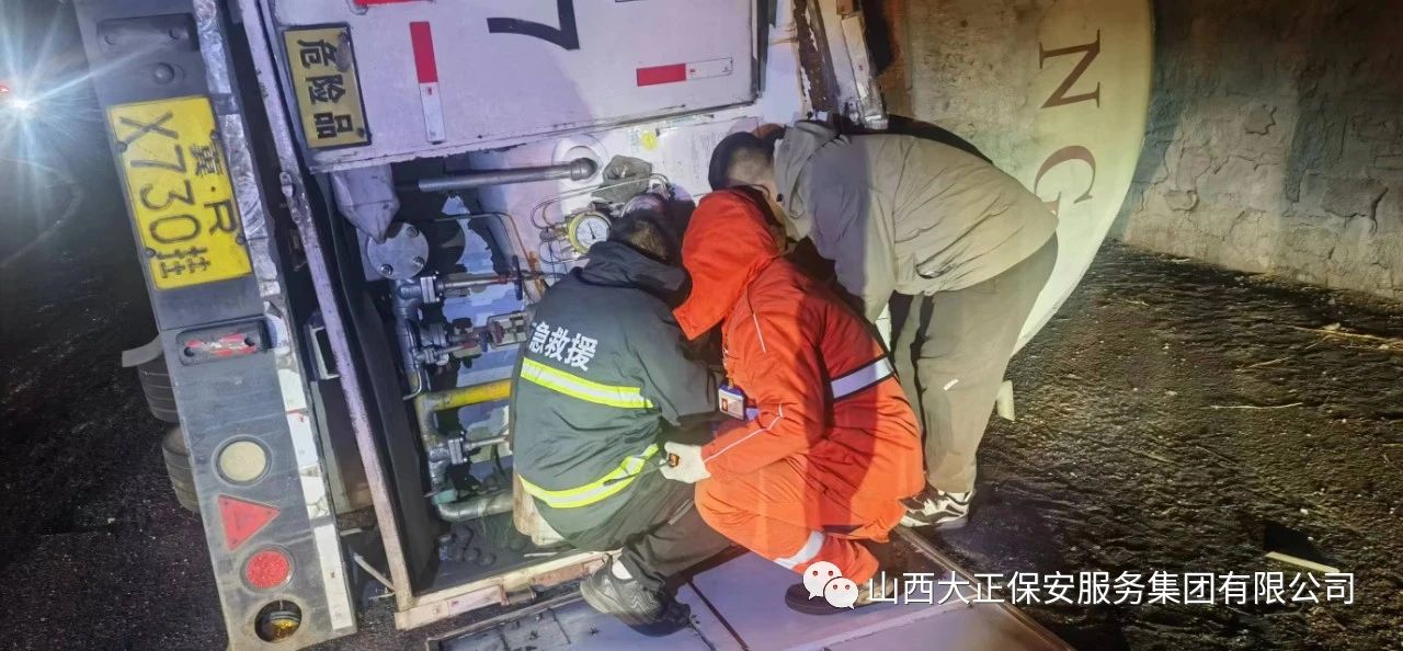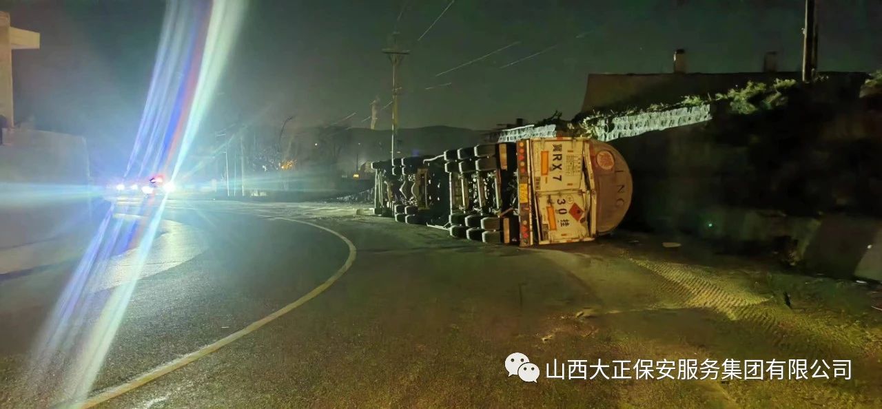 2023年11月23日晚8時,山西大正保安集團公司保德縣守押中隊?wèi)?yīng)急救援大隊接到應(yīng)急局出勤指令,棗林坡有滿載液化氣罐車發(fā)生側(cè)翻,需要派出應(yīng)急人員控制現(xiàn)場,并協(xié)助處理側(cè)翻事故。應(yīng)急救援大隊接到命令后,派出應(yīng)急車輛兩部及應(yīng)急人員5人趕赴現(xiàn)場,協(xié)助交警對現(xiàn)場路段進行管控,保證周圍車輛人員安全。