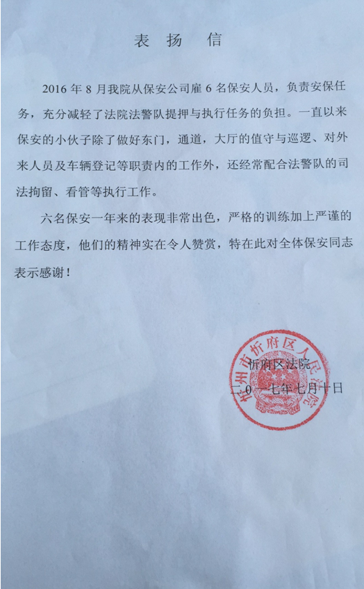 這封表?yè)P(yáng)信既是忻府區(qū)法院對(duì)特勤支隊(duì)駐法院中隊(duì)日常工作的認(rèn)可,更是對(duì)我支隊(duì)工作的肯定。它極大的鼓舞了大家的工作熱情,增強(qiáng)了大家做好工作的信心,同時(shí)也給其它中隊(duì)做了一個(gè)表率作用。